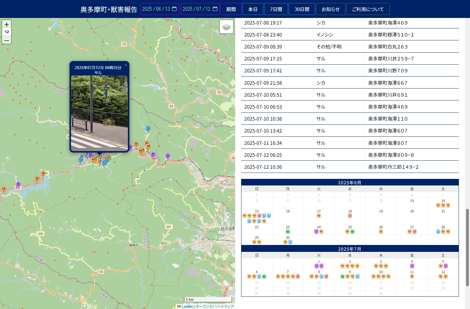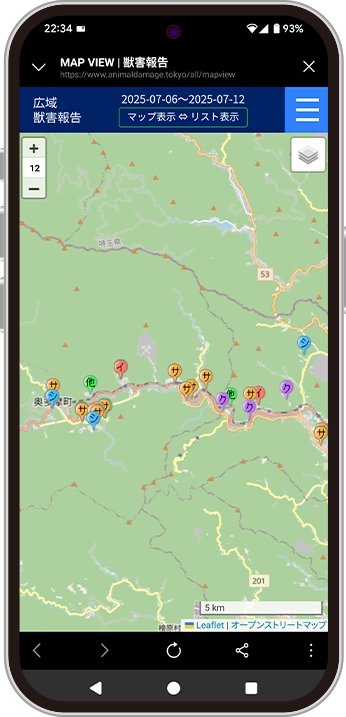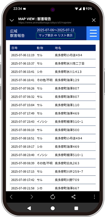 直近1週間や期間を指定して地図に一覧表示。被害報告の分布が一目瞭然。