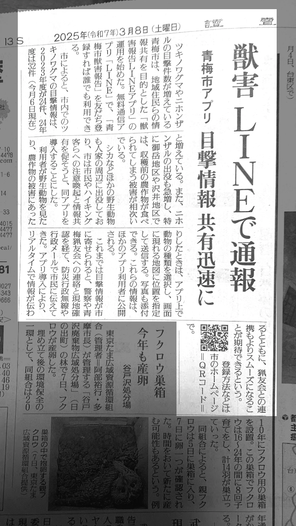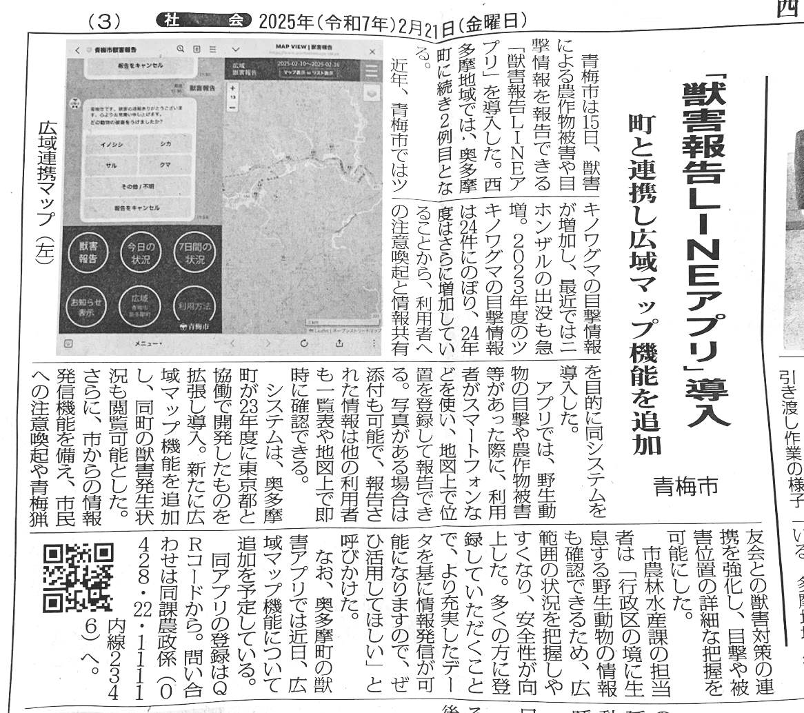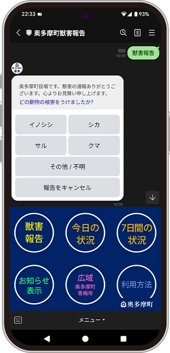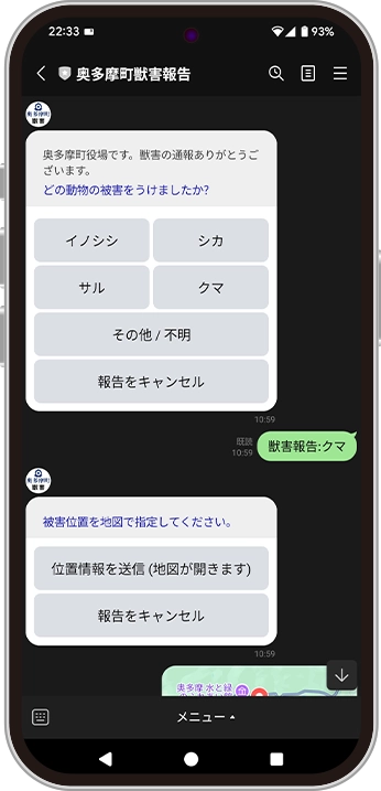 クマ、イノシシ、シカ、サルなどによる獣害報告を手軽にLINEで実現。