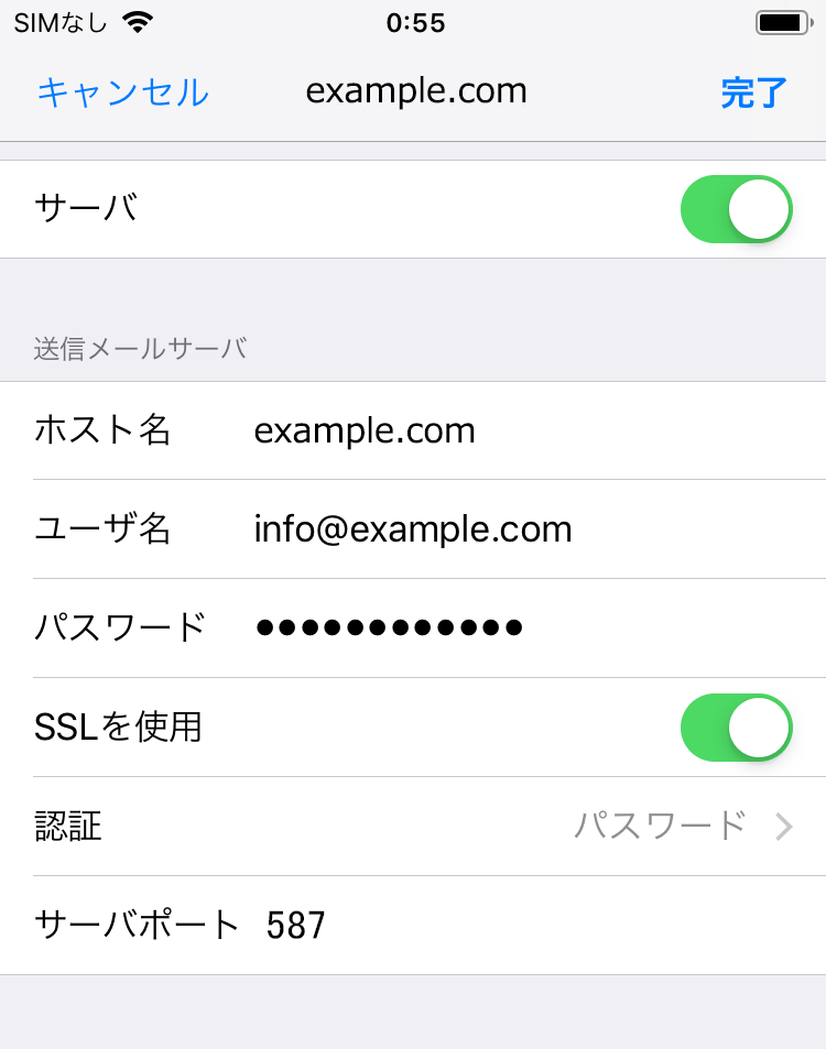ポートは 587 です。接続失敗する場合は 465 をお試しください。