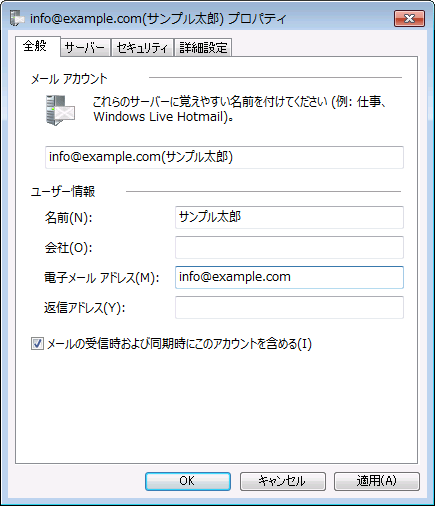 アカウントタブで「プロパティ」をクリックします。
