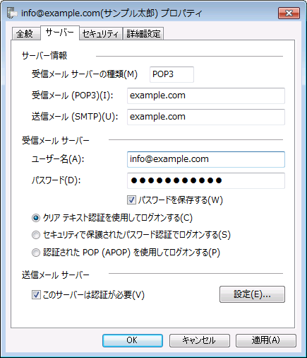受信メールサーバー(POP3)、送信メールサーバー(SMTP)共に、ご自身のドメイン名を登録ください。