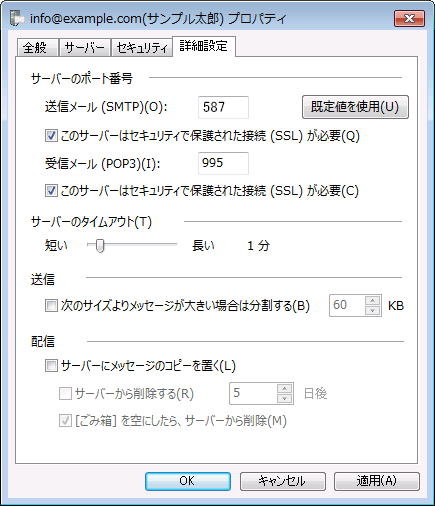 送信がうまくいかない場合は送信サーバー(SMTP)を「465」でお試しください。