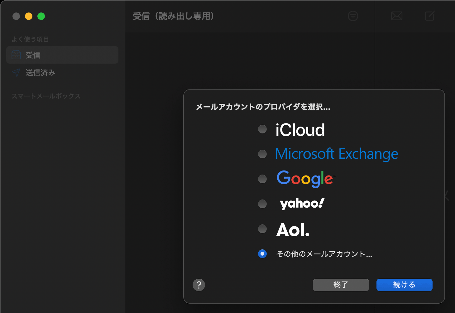 「その他のメールアカウント」を選択して「続ける」をクリックします。