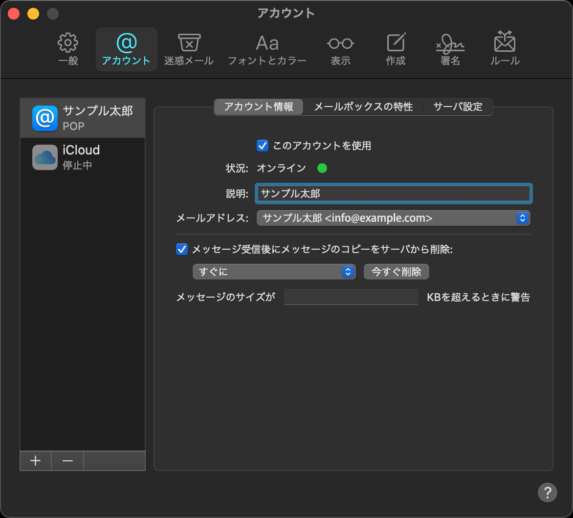 「メッセージ受信後にメッセージのコピーをサーバから削除」をチェックします。